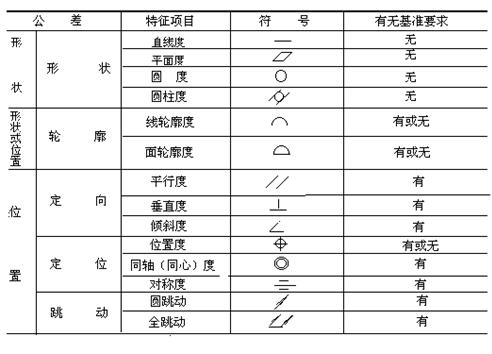 标准gb/t1182-1996《形状和位置公差》中规定,形状和位置公差共有14个项目,其公差 征项目的名称及符号见下表。